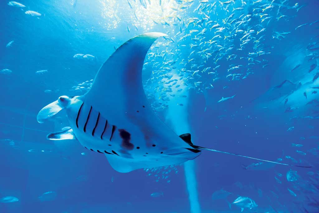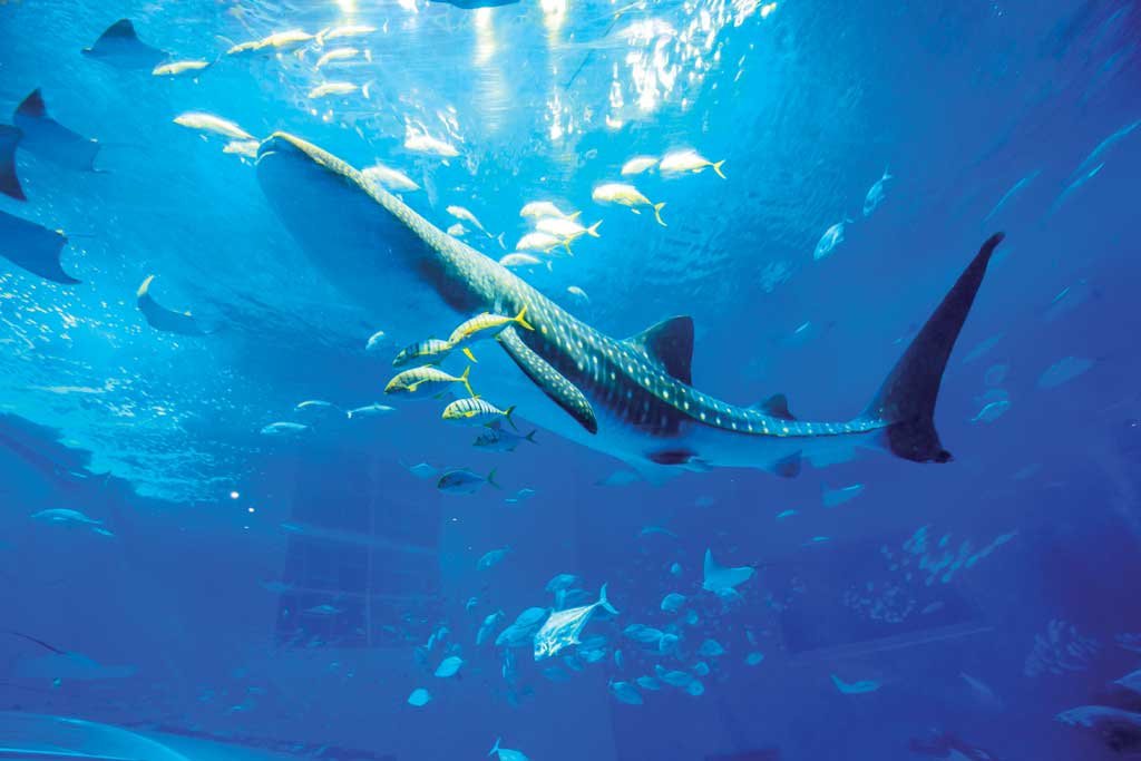 แทงค์ขนาดมหึมาที่บรรจุน้ำทะเลกว่า 7,500 ลูกบาศก์เมตร โดดเด่นด้วยกระจกอะคริลิกใสหนา สามารถชมปลาฉลามวาฬยักษ์ที่แหวกว่ายคู่มากับกระเบนราหูและฝูงปลานานาชนิดได้อย่างใกล้ชิด
